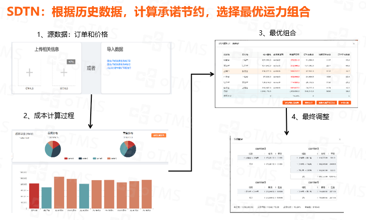 通过在大中型企业运输管理领域的多年沉淀,oTMS推出了SDTN算法。可对企业的订单、运输方式和运力资源进行优化匹配,从而得出最优策略,精准定位降本空间,同时在运营中使用动态调整策略来实现持续优化。