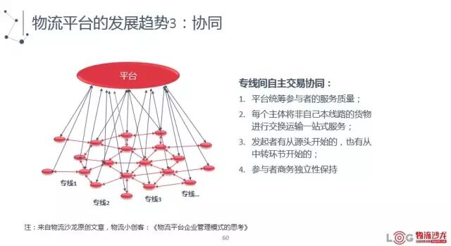 比如说专线间自主交易的协同,现在专线之间也不断的进行相互交易,那这样的交易如果能有一个统一的平台能够成为交易的中间方,这样的平台可能成为专线公司联盟的载体,或者说这些线路公司希望能这样一个平台能够协同他们,来完成他们之间的交易效率的提升和交易量的集聚。但在这里,协同要非常注意的一点是商务的独立性,所谓的商务独立性就是说,你可以让我和你一起玩,但是我还是要自己玩。就是大家能够用你的平台,能够参与你的平台,但是不能影响我原有的生意,因为我原来的东西是我生存的根本。那协同中也有其他的模式,我们可以关注一下沙龙里的原创文章,物流小创客写的《物流平台企业管理模式的思考》,这种管理模式的思考,文章中放了几类的平台,都是非常值得关注的。因为不论是企业间的联盟,还是园区来做统筹,都能通过企业之间在股权上的整合或者是地域上的整合,来实现共同的对外部客户,然后在外面拓展新的网点,发展新的客户,来实现大家都能获得新的生意,这样大家利益的协同就能更快的找到一致点。