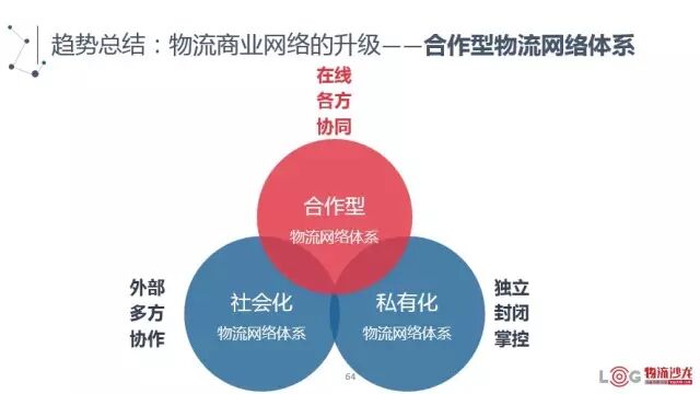 合作型的物流网络体系,最明显的一个特征,是在线,也就是说所有的参与者都是在线的,这就是互联网带来的最大的改变。另外是说,各方是协同的。就是说,大家共同参与,同时又被其他参与方管理,整个网络是可以传递你的管理诉求的。