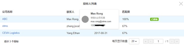 您可将感兴趣的承运商加入到您“候选承运商”名单,只有名单内的承运商才可与您互看联系方式,从而减少不必要的沟通成本。