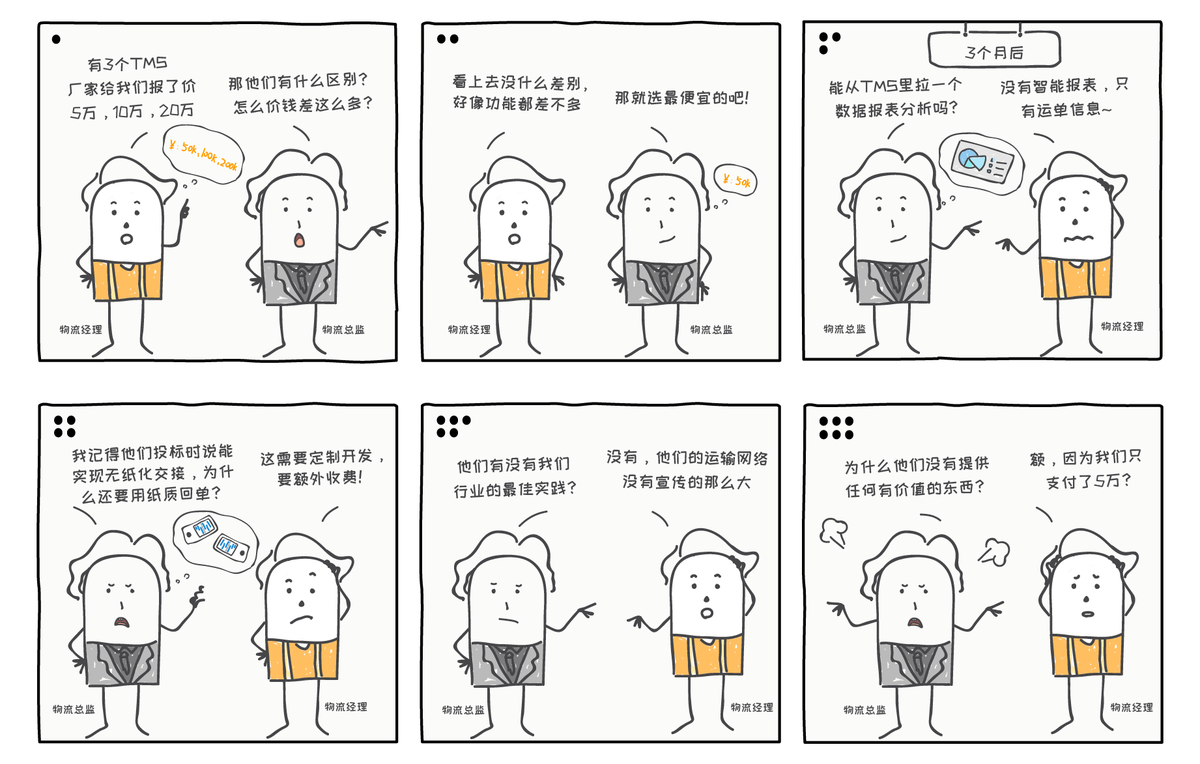 如今,现在越来越多的企业已经意识到了使用信息化工具管理运输的重要性,很多企业有意识地知道自己应该选择一款TMS并在市面上进行搜索。在TMS选型过程中,价格显然是大家较为关注的一点,但就经验看来,如将价格作为最重要的考量因素,结果往往会落入低价陷阱。