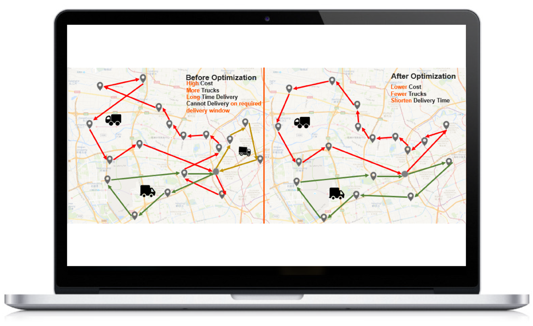 Route optimization reduces costs for clients & carriers who either have captive fleets or at least pay on trip basis to fully utilize trucks and drivers, shorten the total travel distance, increase loading rate.