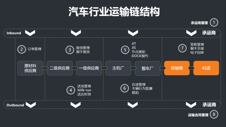 oTMS汽车物流解决方案涵盖入场物流、整车/整机销售物流、配件供应和配件销售物流等,能够协同供应商、组装厂、整车厂和经销商,优化全链条运输。