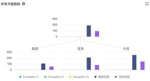 按月细分展示丢失、破损、特殊费用等异常订单量,不同柱子代表不同异常情况对应订单数量。