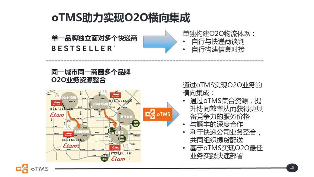 此外,oTMS现有的客户,比如李宁、绫致等品牌的门店重合率其实很高,都在同一商圈甚至更多是同一个商场的楼上楼下,并且大家的O2O也都是通过oTMS,通过顺丰来进行的。因此我们可以通过优化,将整个O2O的效率提升,从而帮助顺丰、帮助我们的客户共同来降低成本!此外后续的对账,通过系统自动化的接口,也可以大大降低客户自生及顺丰的工作量和时间,从而做到零差错的实时对账。
