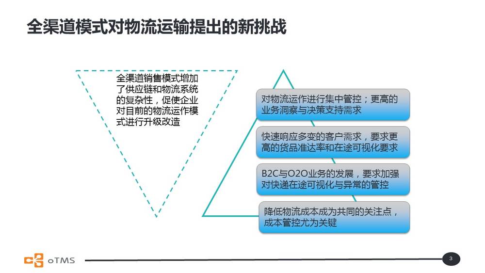 2、O2O订单量初始阶段虽然不那么稳定,但是增长潜力巨大。像oTMS的某家服装客户每年O2O的订单量年增幅接近70%。但是如果因为一开始订单量比较低,从而没有重视信息化的服务,到了后期就会有很多问题,包括整体费用、服务时效、异常管理等等都会是新的挑战。今天也邀请了一些对O2O有深入理解和实践的企业跟大家来分享,都是些干货。我们也希望通过这样的分享,打造O2O的行业最佳实践,帮助那些计划来做O2O的企业。