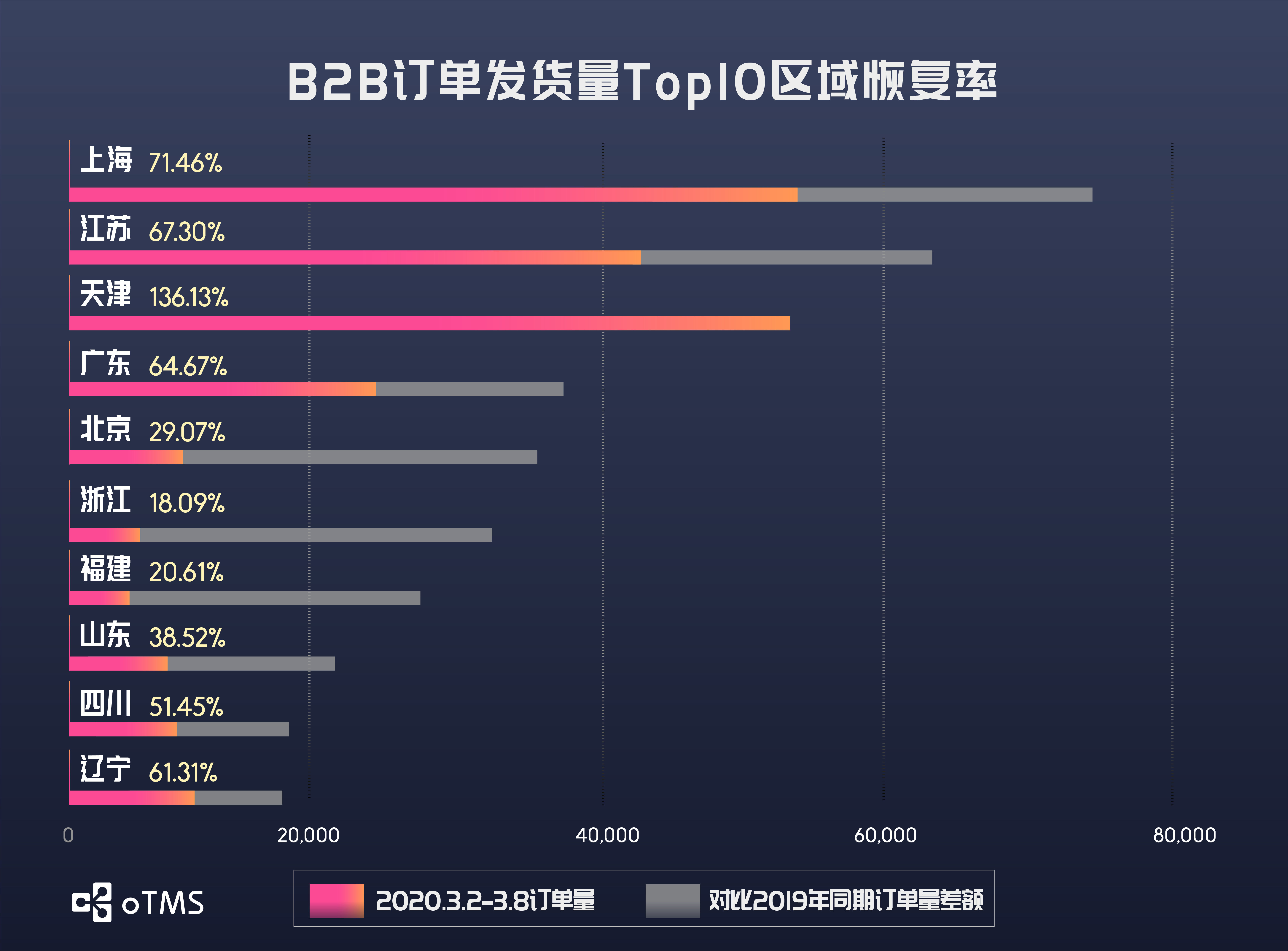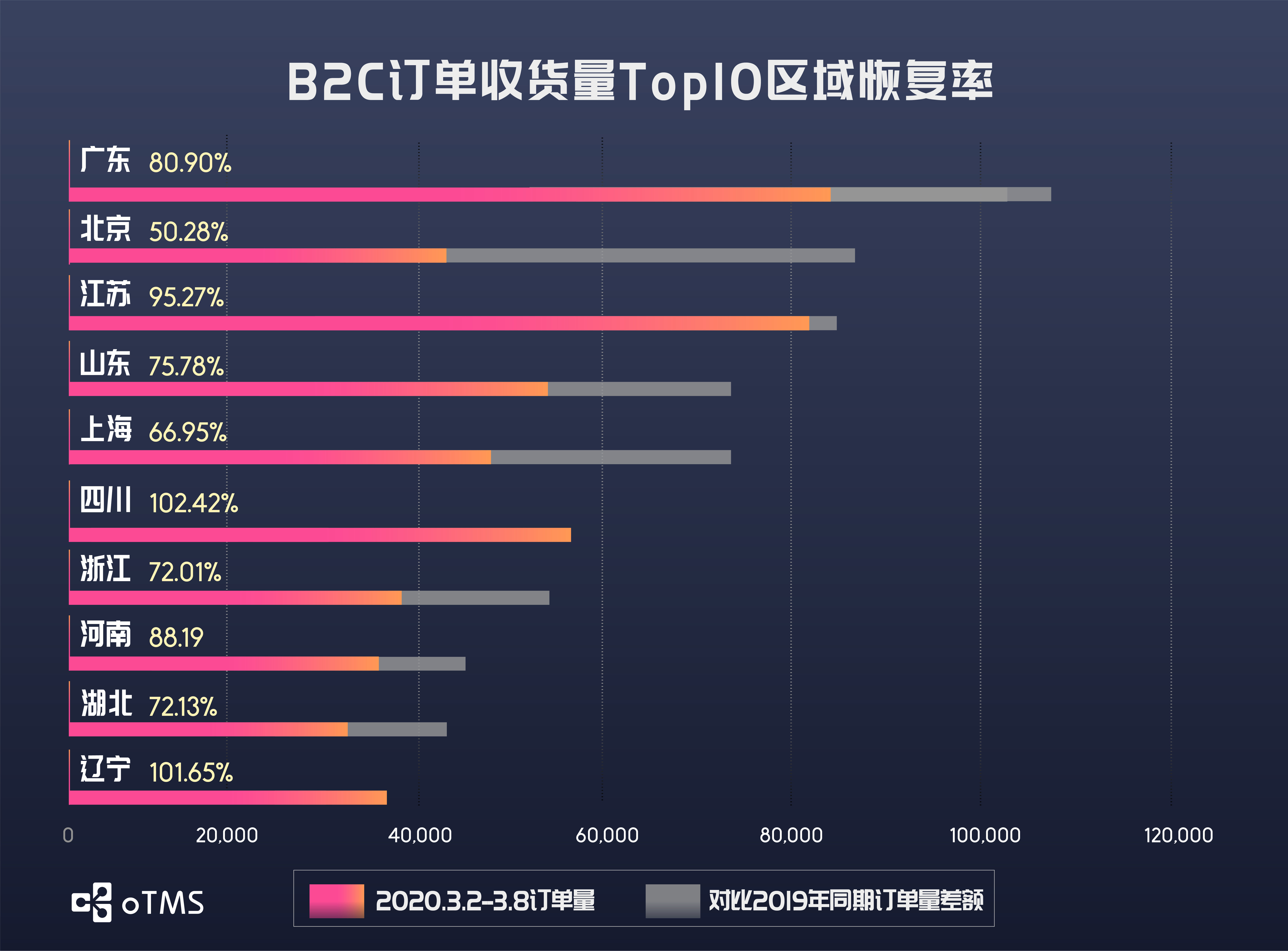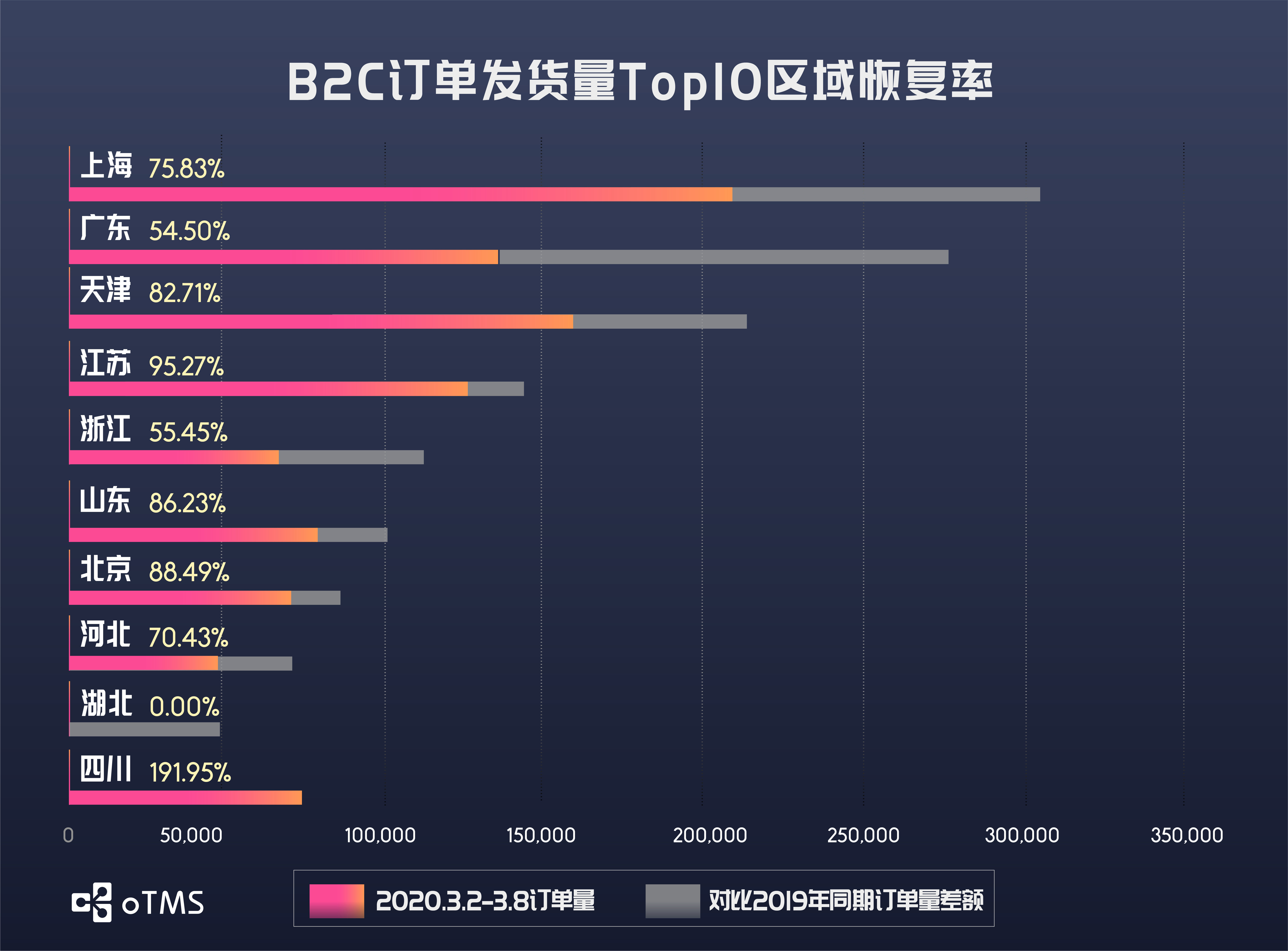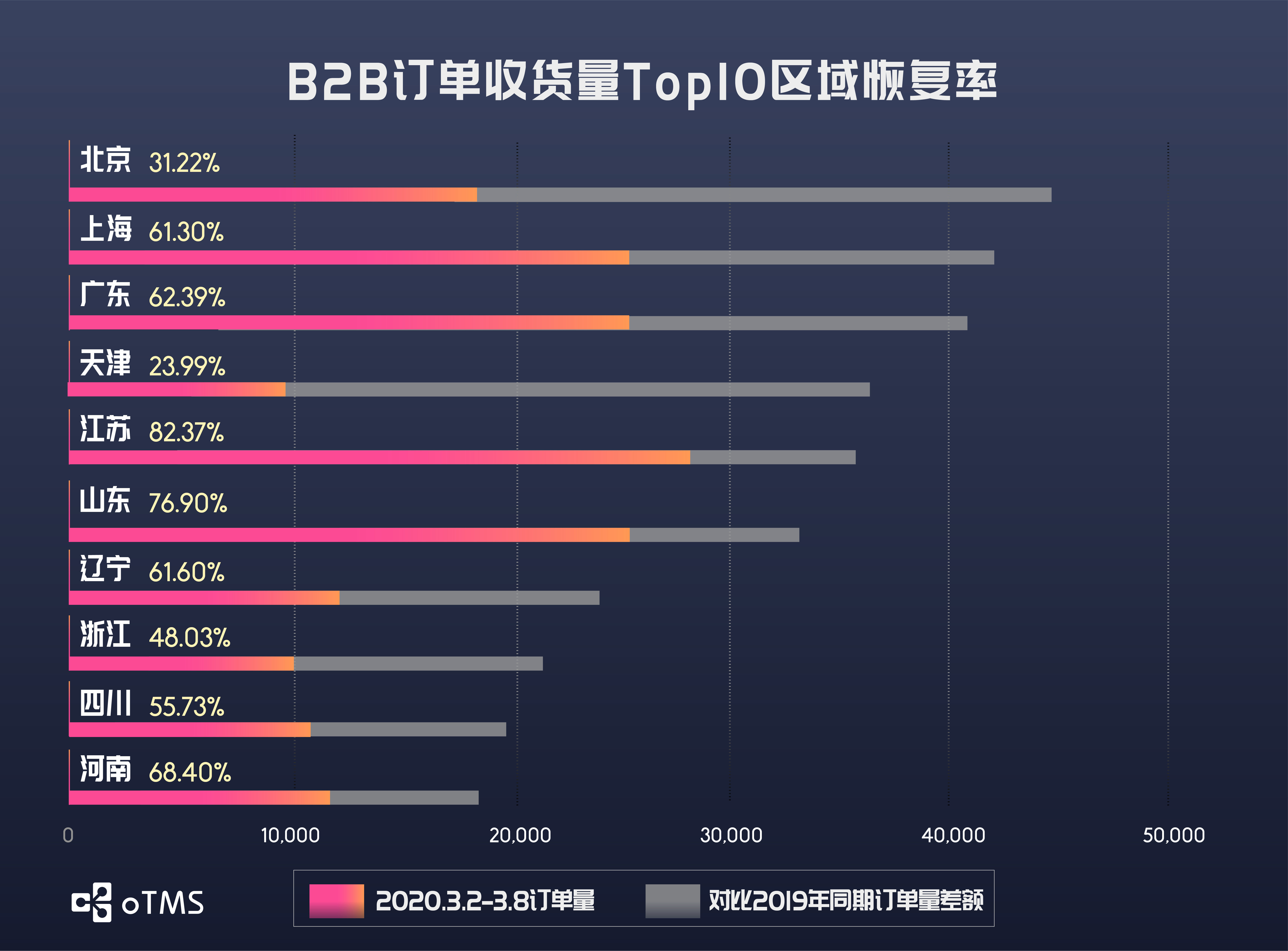 B2B主要收发货地区的恢复率都较之前一周进一步提升。B2B发货量排名前十的区域中,仅北京、浙江、福建和山东四地恢复率未超过50%;收货量恢复率方面,仅有北京、天津及浙江恢复率不足50%,排名末位的天津恢复率达到23.99%。