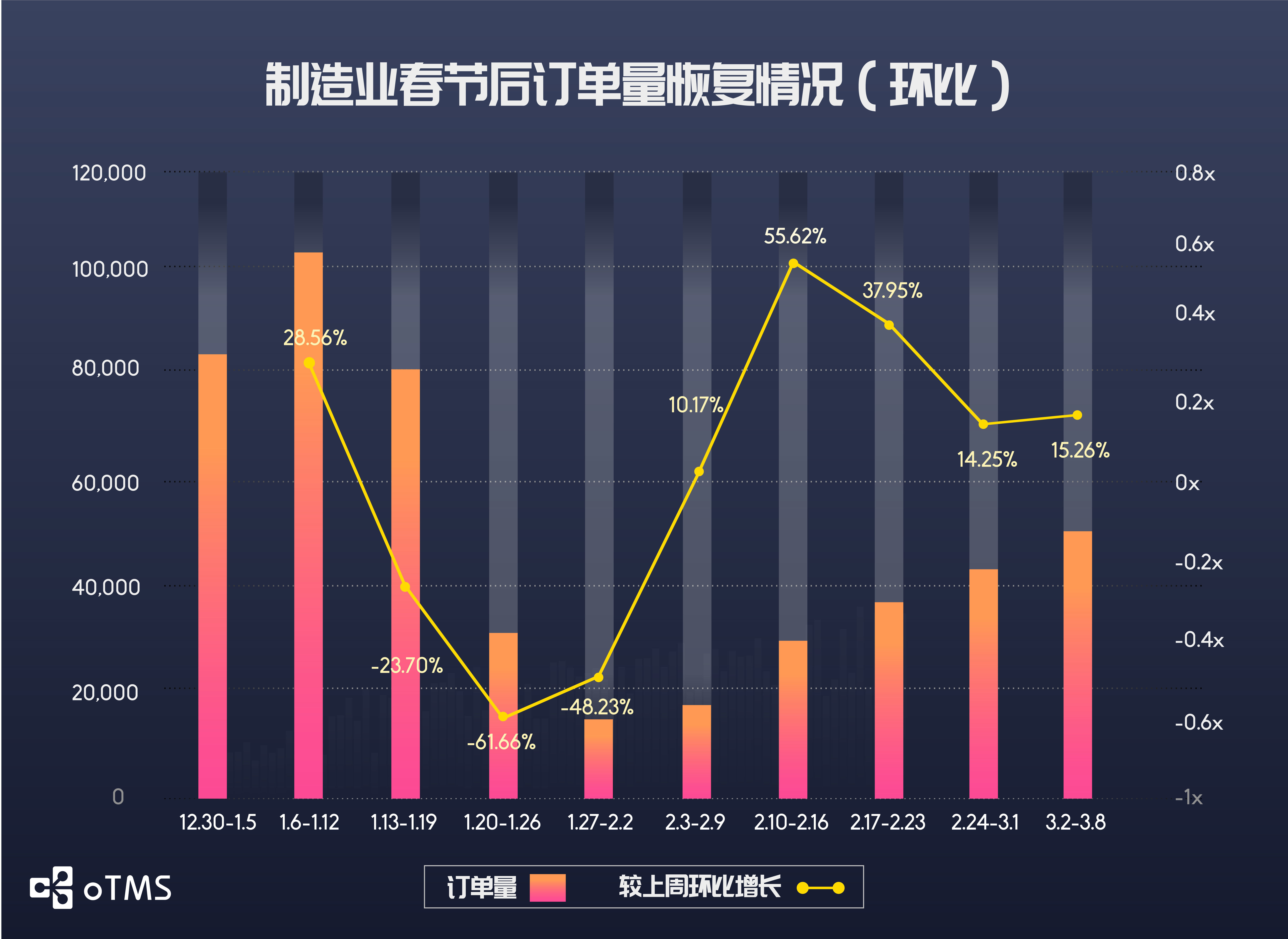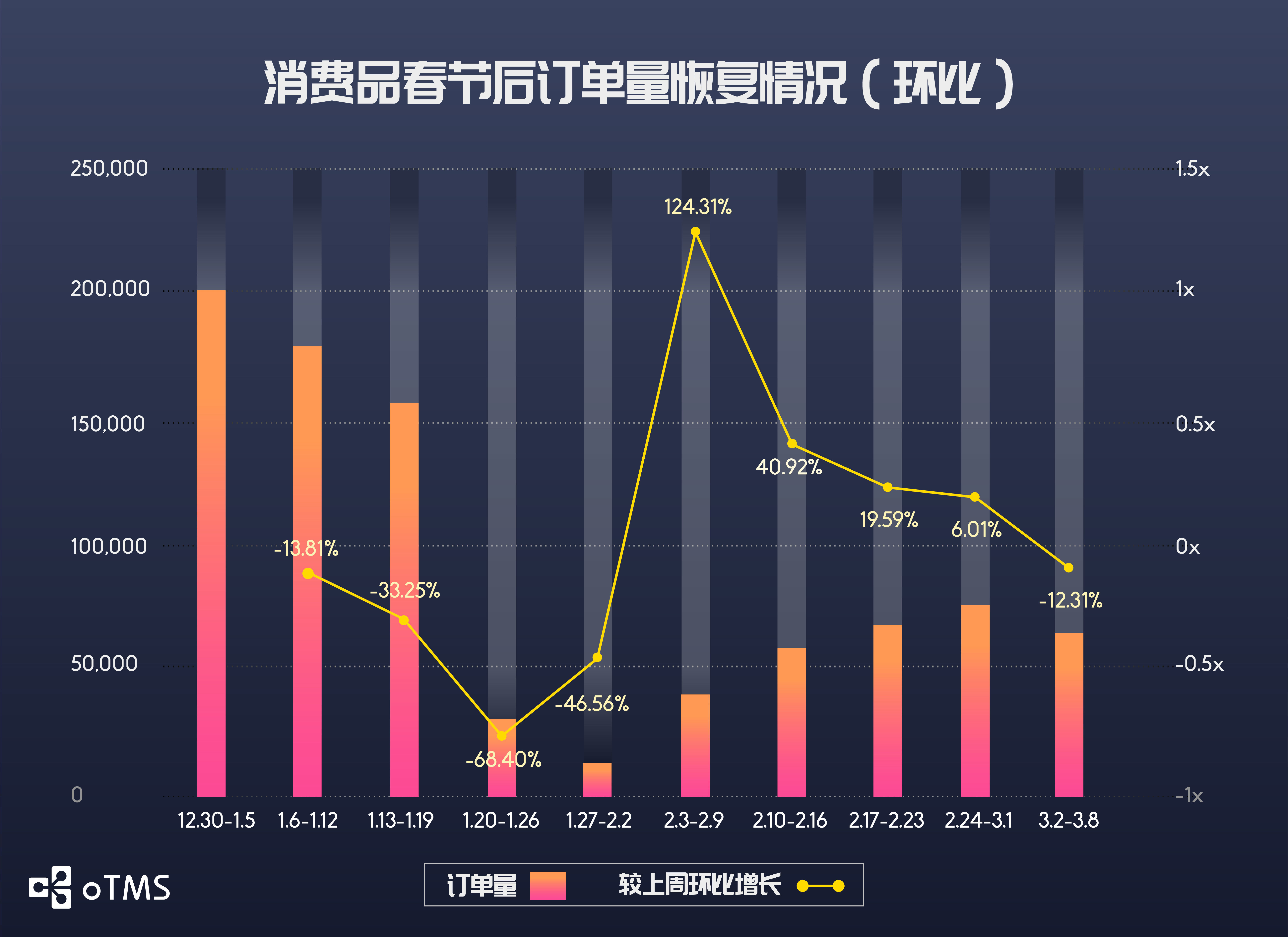 消费品行业或受原材料供应影响,总订单量有所回落,为节前高峰的34.14%,周发货订单量不足10万单。