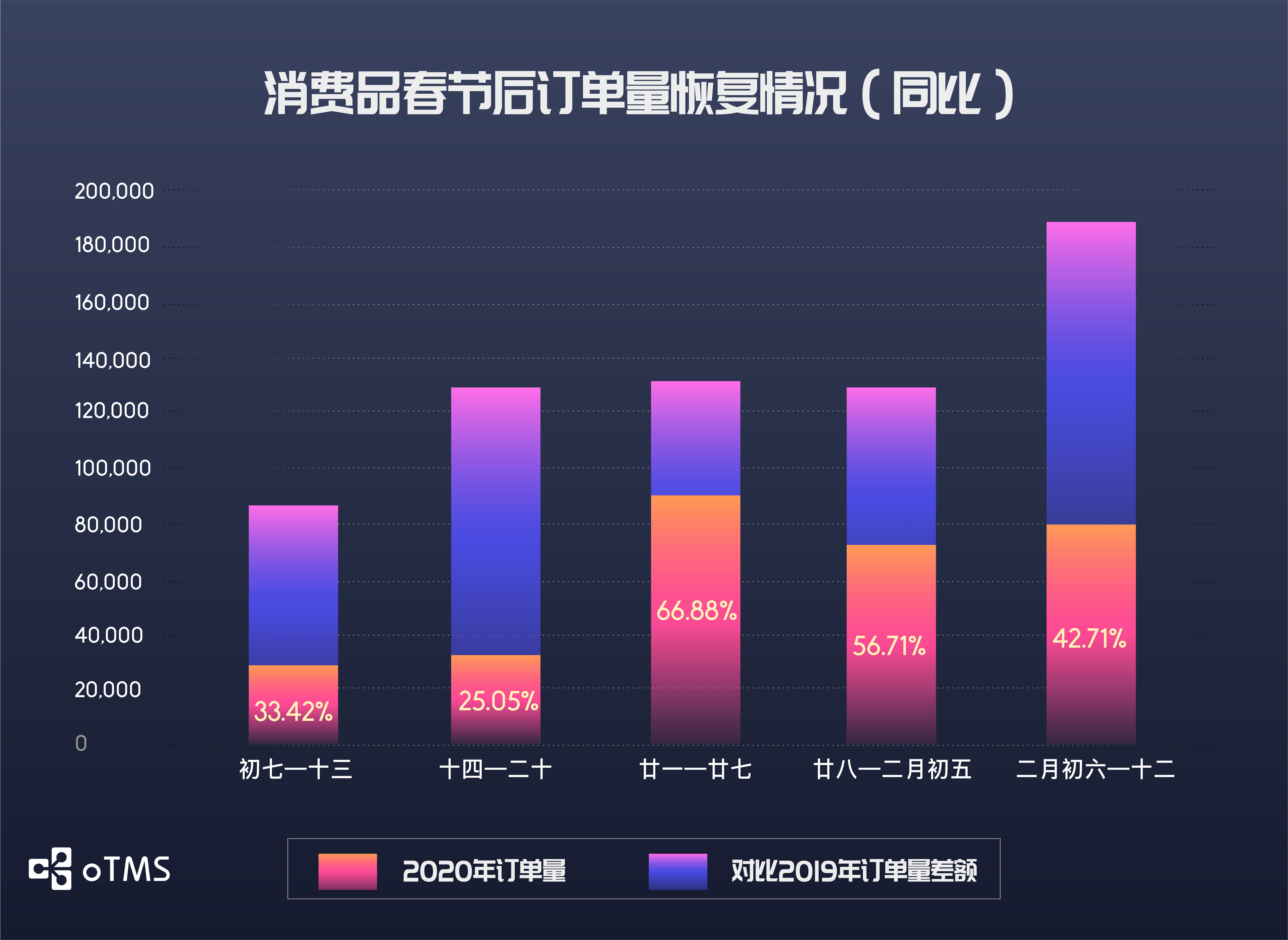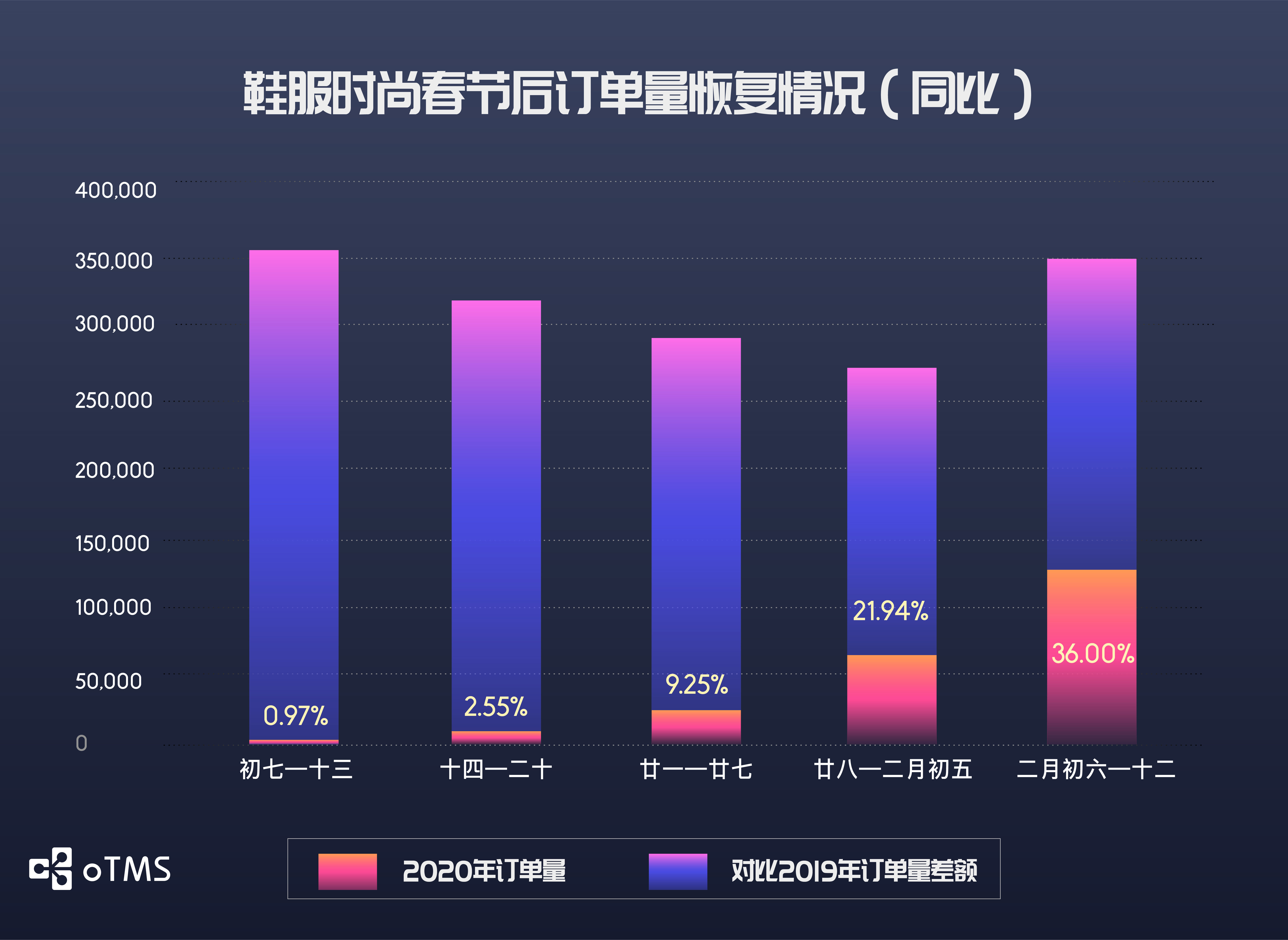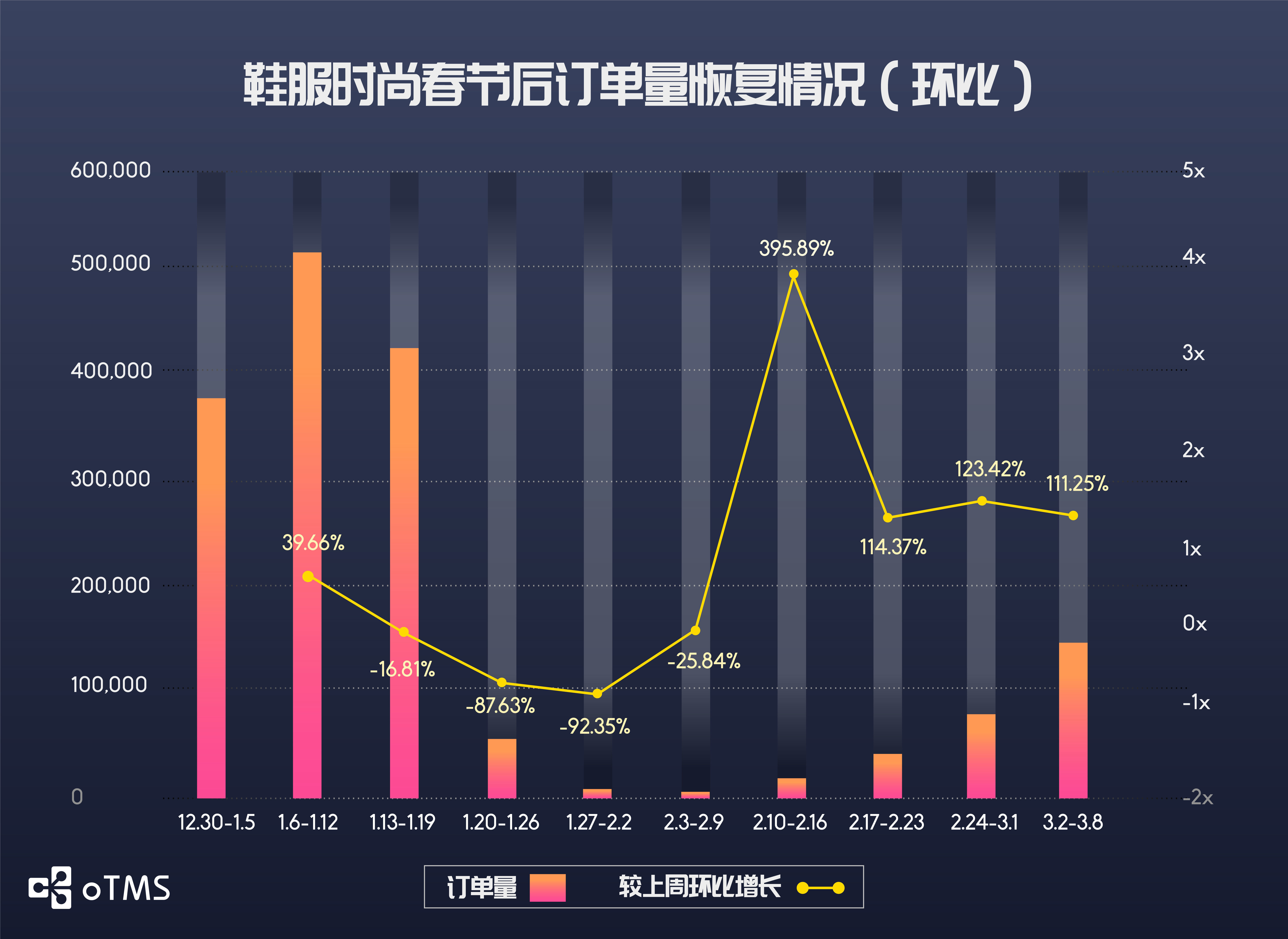 然而,随着疫情受到控制,我们还是能够看到曙光。伴随着部分地区门店逐渐开业和店内促销,节后表现尤其惨烈的鞋服行业订单量通过5周的时间已恢复至36%。从农历春节后第一周的不足5000单增长至12万单,翻了24倍。