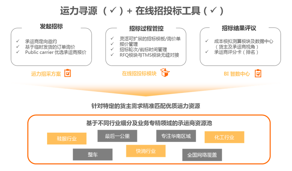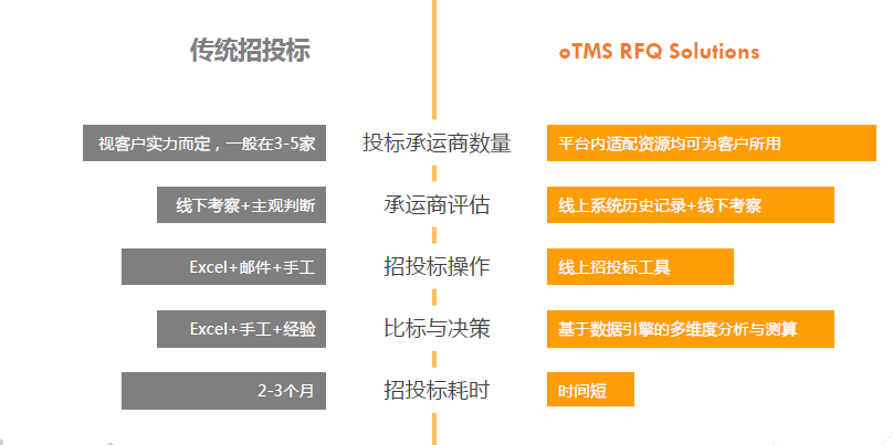 在oTMS构建的运输招投标系统中,为招投标双方提供了透明和客观的行业和客户数据,以及标准化的采购进程,这些数据来自平台内数年来的订单和承运商作业数据,通过大数据分析和筛选提取而来。