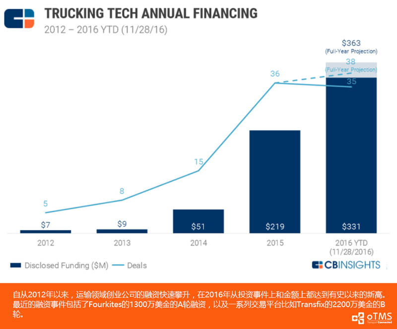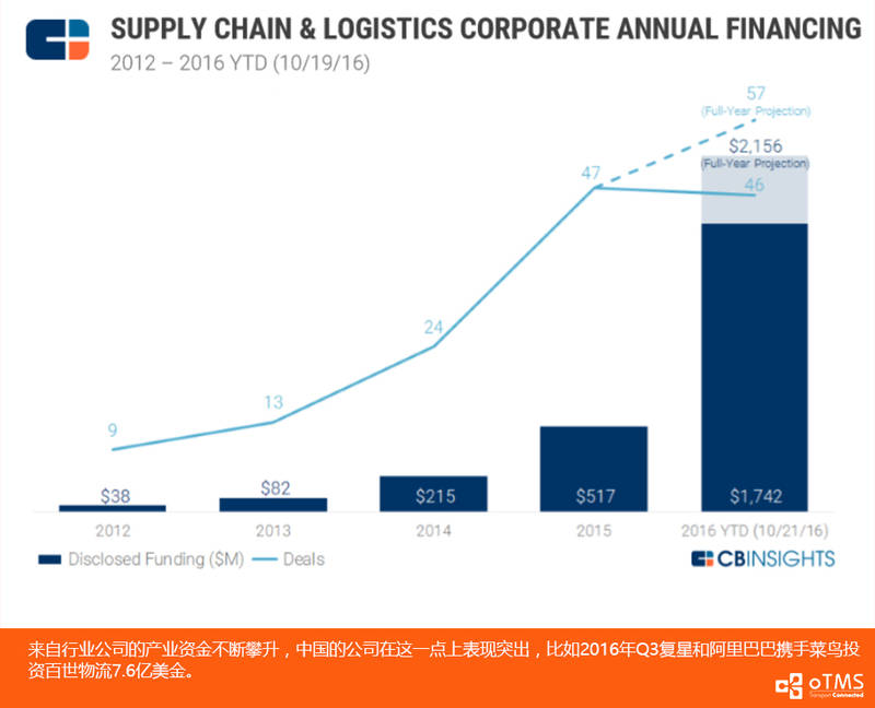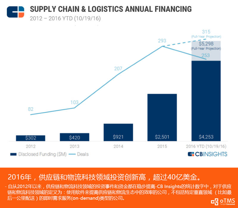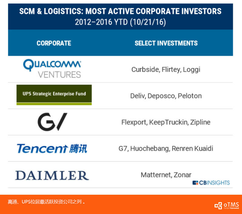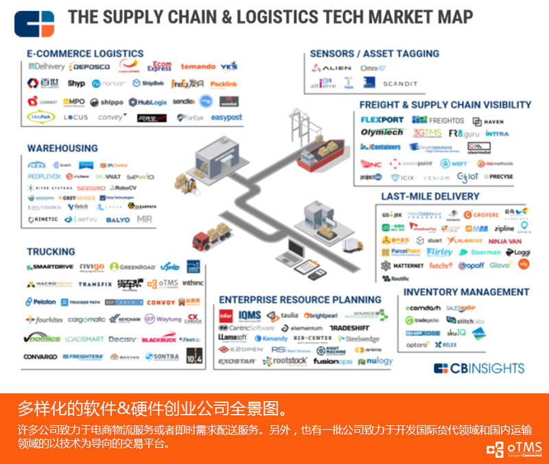 最近看到了国外著名的风险投资数据平台公司CBInsights一个专题报告,特别想分享出来,题目是《供应链和物流领域创业公司-投资、并购和趋势观察》,涵盖了全球范围的该领域的投资数字/事件分析,里面也包含了大量中国和美国的供应链和物流领域的创业公司,你可以看到很多耳熟能详的名字,比如oTMS:>