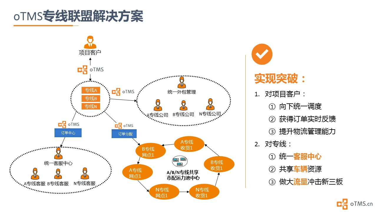 通过oTMS跟各个企业TMS的配合,把所有园区里面各个专线网点连接在一起。一方面,实现统一调度与订单实时反馈;另一方面,实现资源信息共享,最大限度的提高运输效率。oTMS帮助联盟本身,解决内部资源匹配问题。