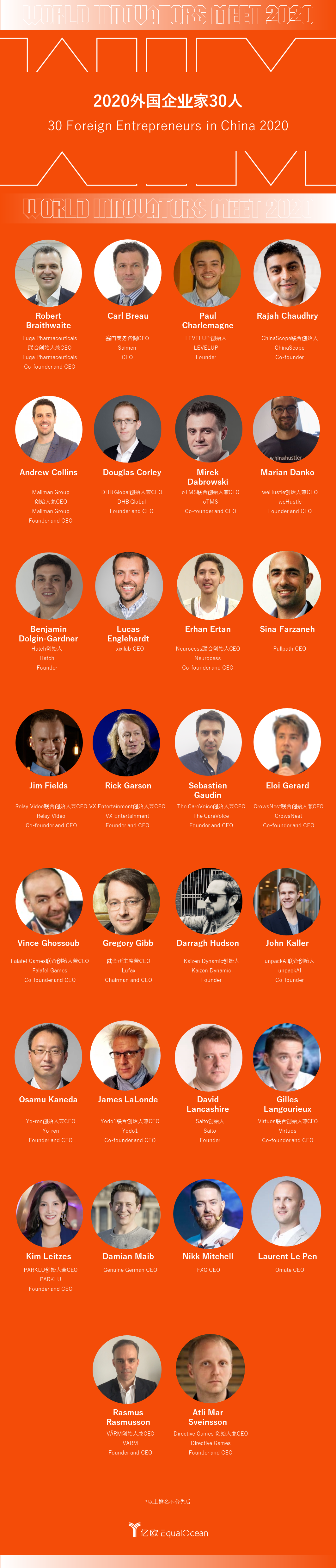 WIM2020以”科创连动世界”为主题,连接来自亚洲、非洲、欧洲、美洲的全球创新者,分享科技创新成果和认知,共同推进”让科技更平等”的理念。WIM是中国科技领域最有影响力的盛会之一,在2020WIM期间,WIM组委会整合亿欧智库全年产业和投资研究工作成果,发布年度重磅“2020世界创新奖”榜单,包括“中国青年科技企业家30人”、“中国人工智能企业家30人”、“2020中国外籍企业家 TOP30 ”等,并配套一系列的研究报告。