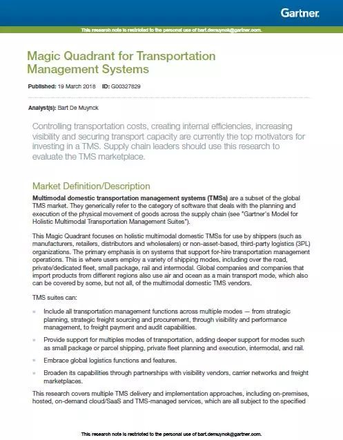 Gartner在报告中指出:“TMS市场正在加速增长。控制成本、提高内部效率、增加透明度和确保运输能力是现阶段企业投资运输管理系统的主要推动力。供应链领导人们应当以该报告为参考来评估当下的运输管理系统市场。”
