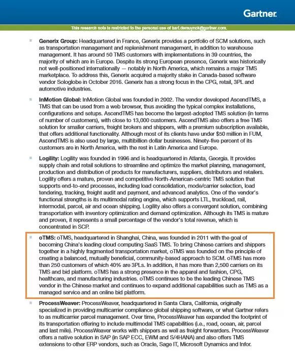 近日,在Gartner公司公布的Gartner 2018年运输管理系统魔力象限报告中,中国运输管理云平台创立者oTMS作为9家企业之一,被全球领先的信息技术研究和咨询公司Gartner列为 “潜力服务商”。