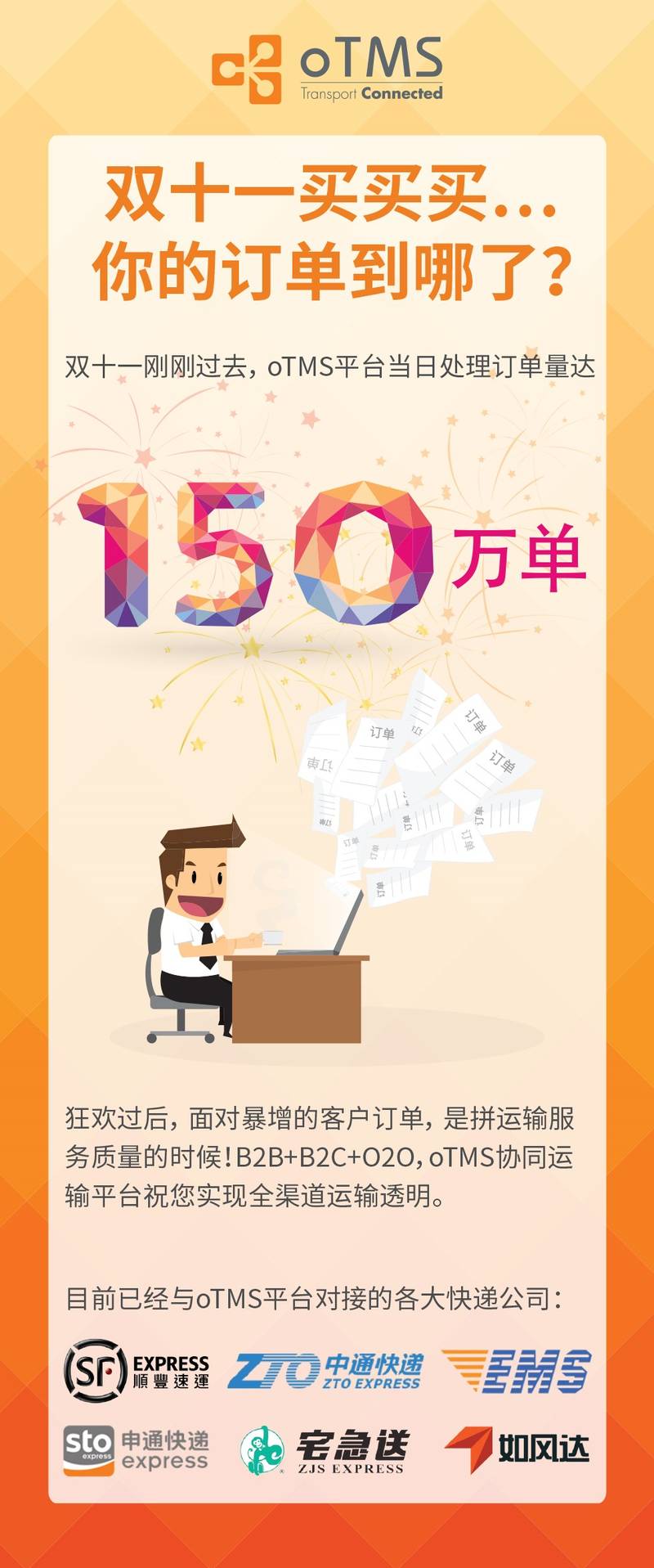 欢过后,oTMS的使命仍在继续,面对如此暴增的客户订单,运输服务质量不容忽视,oTMS运输协同平台为您实时追踪在途运输信息,具备分单拆单、位置上传、异常报警等重要功能,再多订单也毫无压力。