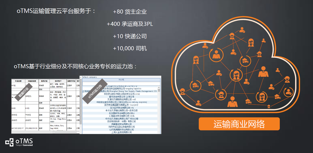 在oTMS云平台上活跃着80余家大型货主企业,400多家承运商及物流公司,顺丰、圆通等国内外快递龙头企业,以及10000多名货运司机,形成了基于不同行业细分及不同核心业务专长领域的庞大资源池。况且,承运商的历史数据均沉淀在平台上,货主可通过重要指标的筛选出潜在的供应商,实现优质运力资源池的有效扩充。