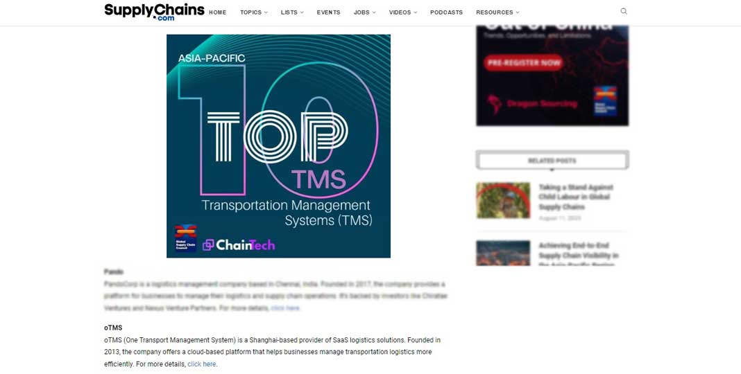 近日,亚太领先的专业组织“全球供应链理事会”GSCC(GLOBAL SUPPLY CHAIN COUNCIL)在其网站SupplyChains.com上评选出了 “亚太十大运输管理系统TMS品牌”,oTMS荣幸成为该榜单中涵盖的唯一一家中国TMS公司。
