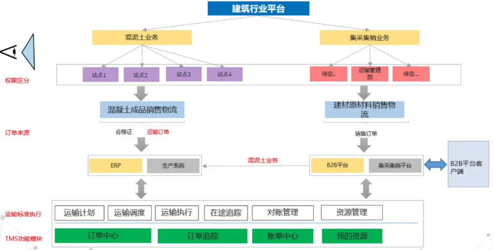 B2B形式的原材料采购业务。目前该运输业务是传统线下模式,由司机手动对接,无标准流程。客户希望通过新搭建的B2B平台,实现建材原材料的采买和销售,同时由TMS提供门到门的标准运输增值服务。运输模式为标准普货汽运,含大宗运输。