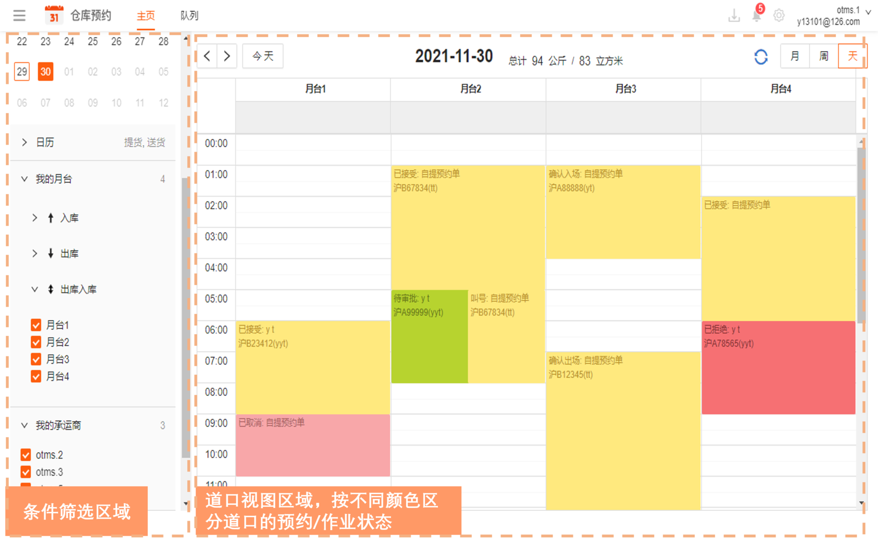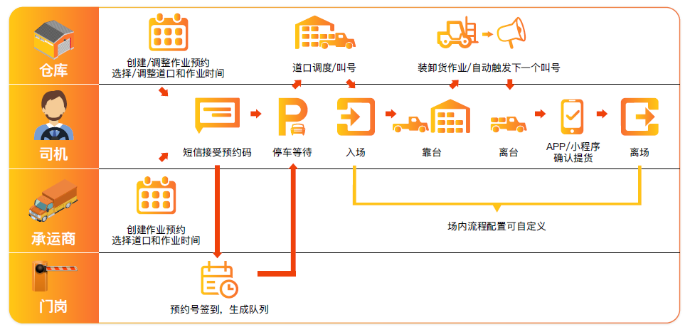 支持承运商/司机按照仓库到货/提货要求提前预约仓库道口及时间,实现承运商、车辆、道口、收发货作业人员等各类资源的协同管理,增加仓库运作计划性,提升仓库利用率。