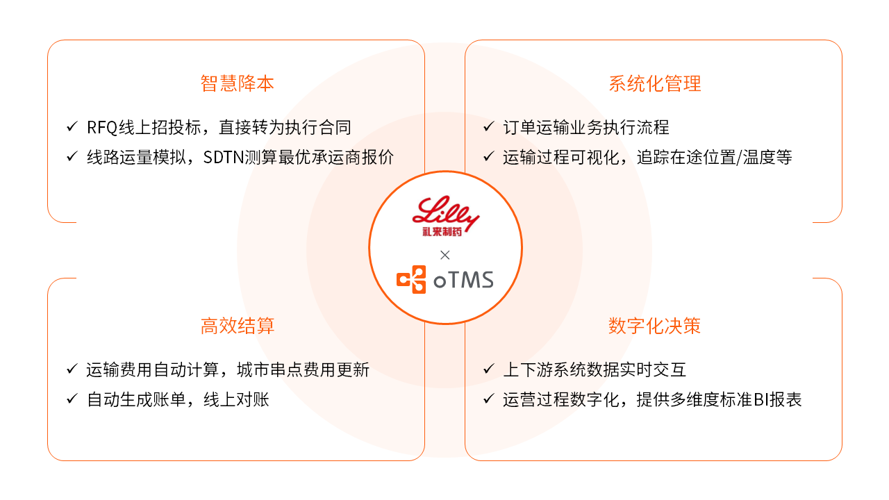 此次合作,oTMS将利用oneTMS运输管理系统、RFQ招投标模块和SDTN智能优化算法为礼来中国赋能,实现系统化、标准化、在线化和可视化的高效运输管理,包括: