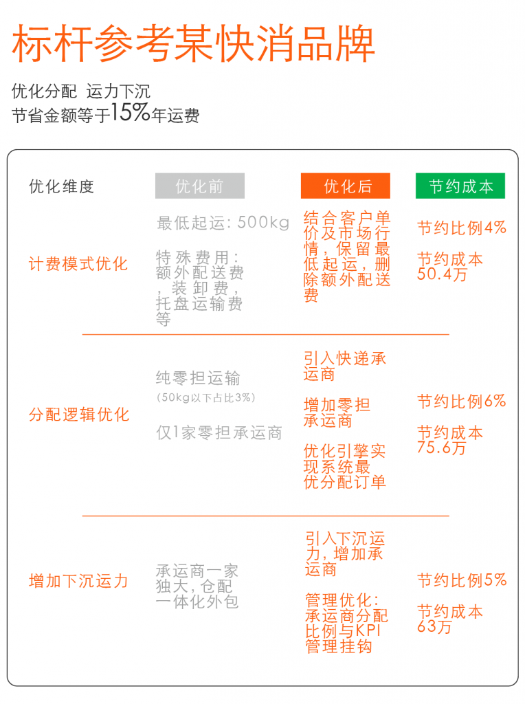 我们那些很快就实现大幅节省目标、承运商服务水平也快速提升的客户都早早决定了让承运商竞争上岗。这种竞争不是指固定的年度招标,而是在运营期间不断为了生意竞争。以我们的经验来看,激励督促承运商配合数字化转型最好的方法就是将他们的表现直接和收入挂钩。我们通过系统内的动态分单机制和奖惩措施把这两者联系起来,而这也正是数字化最直接和最实际的应用。