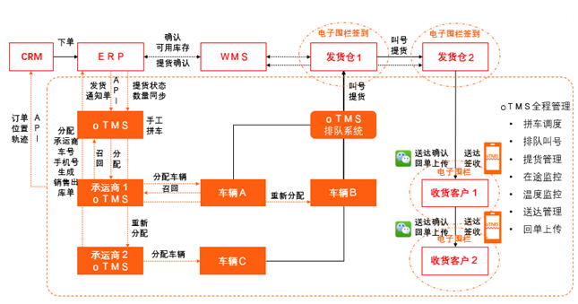 oTMS物流跟踪系统在货主上游提供了标准化API接口(包括下订单、订单取消、商品信息、订单物流状态追踪等接口),货主下游则对接目前主流的快递企业、承运商,支持货主通过一次对接,完成企业与承运商之间的无缝衔接,从发货到签收,订单全流程管理,为货主企业实现多系统一平台的透明管理,解决货主在物流管理上的担忧。